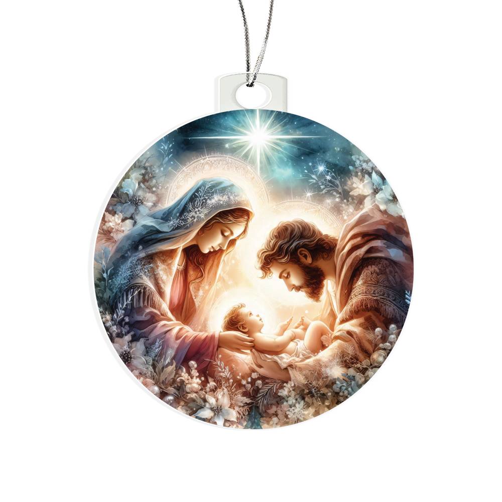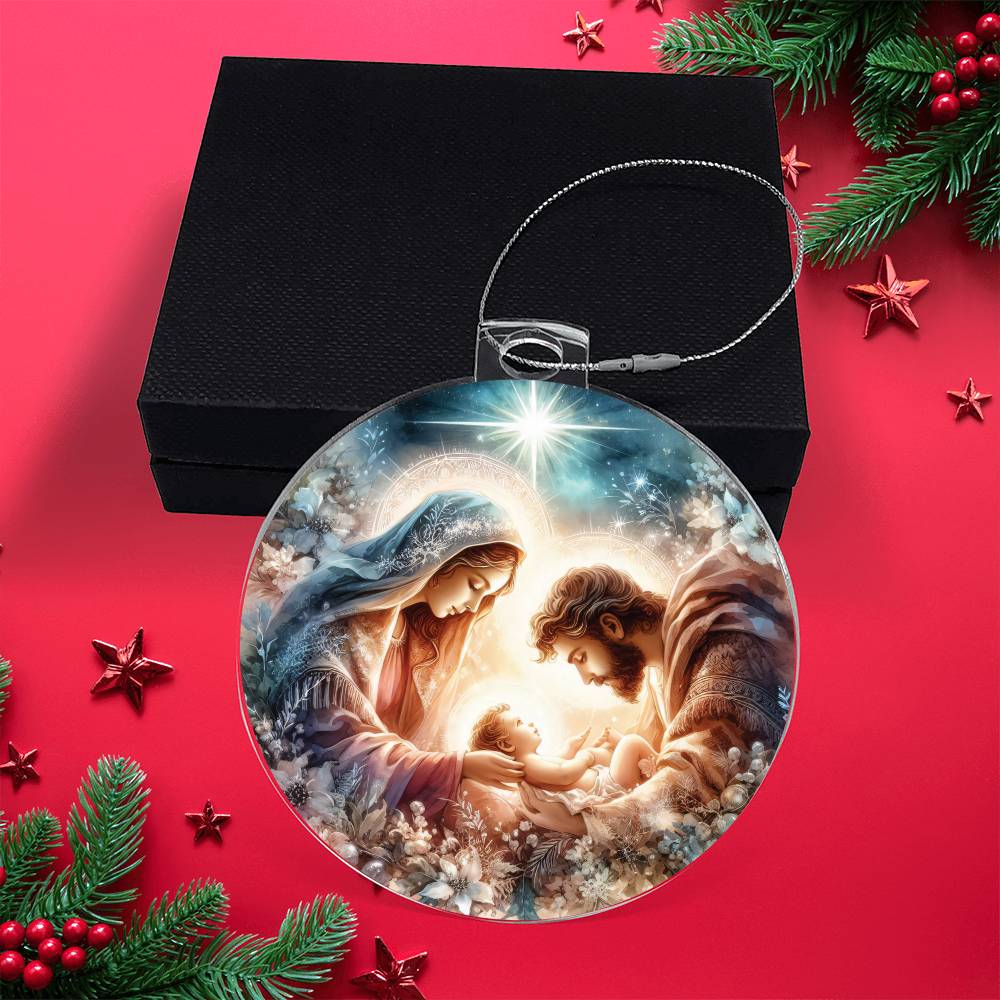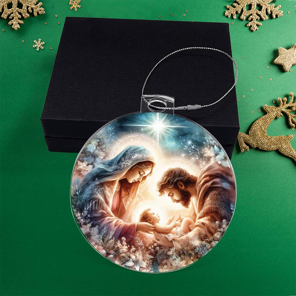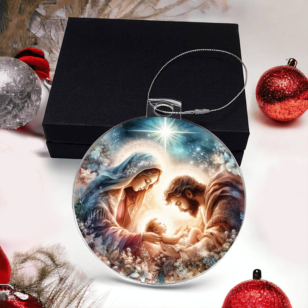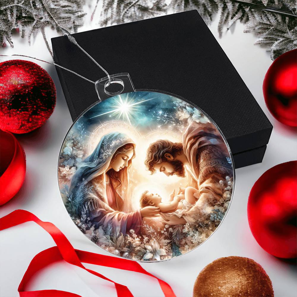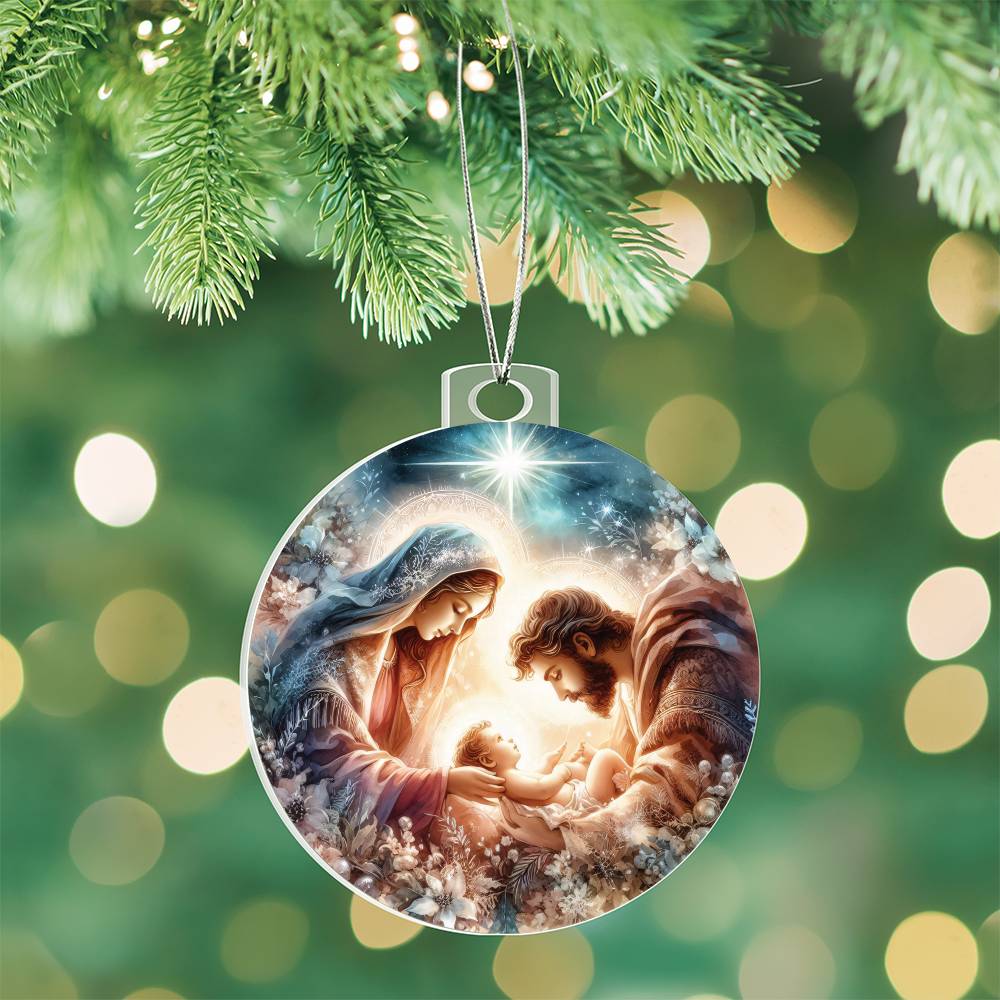 A breathtaking portrayal of Mary, Joseph, and Baby Jesus framed by elegant blossoms. This ornament symbolizes love in full bloom and faith everlasting.