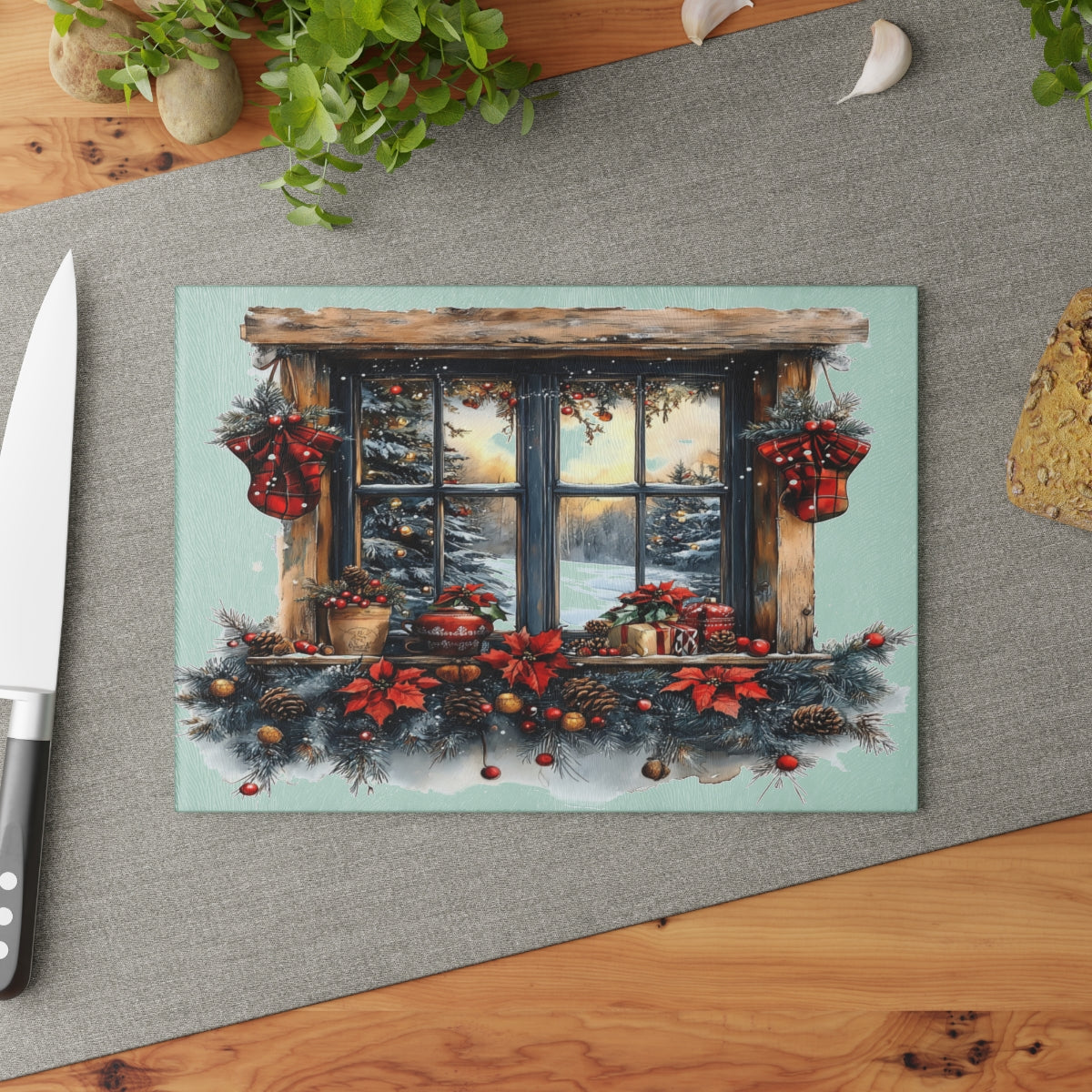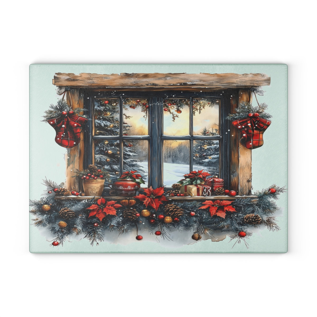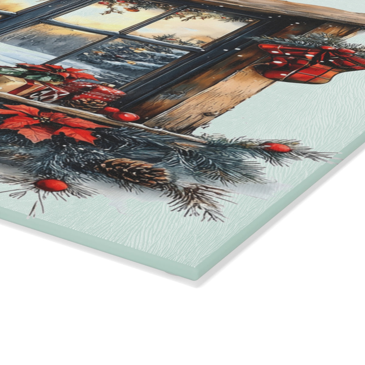 Plaid Stockings & Pine Window Scene Glass Cutting Board