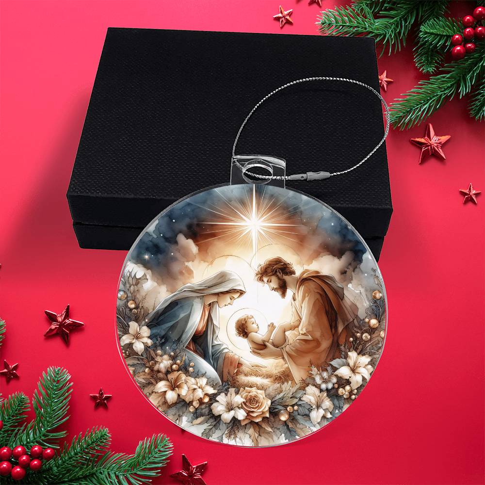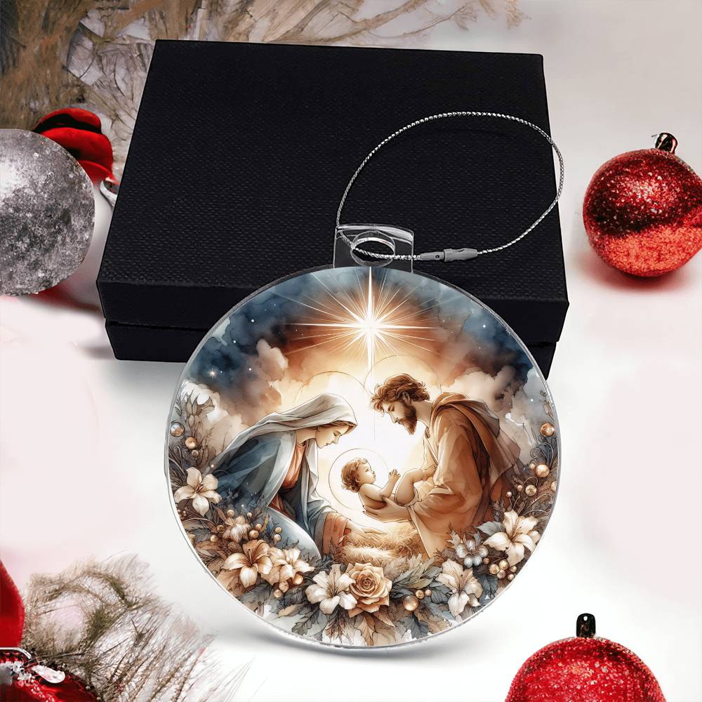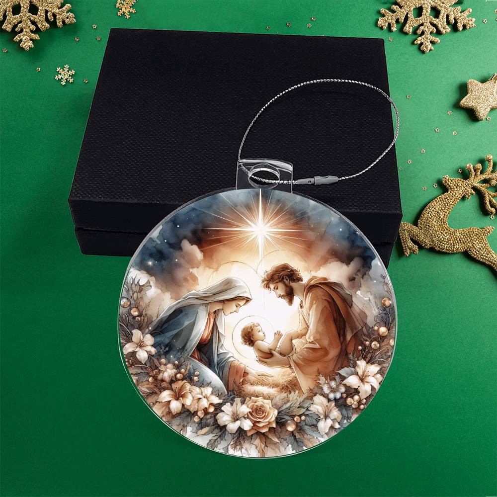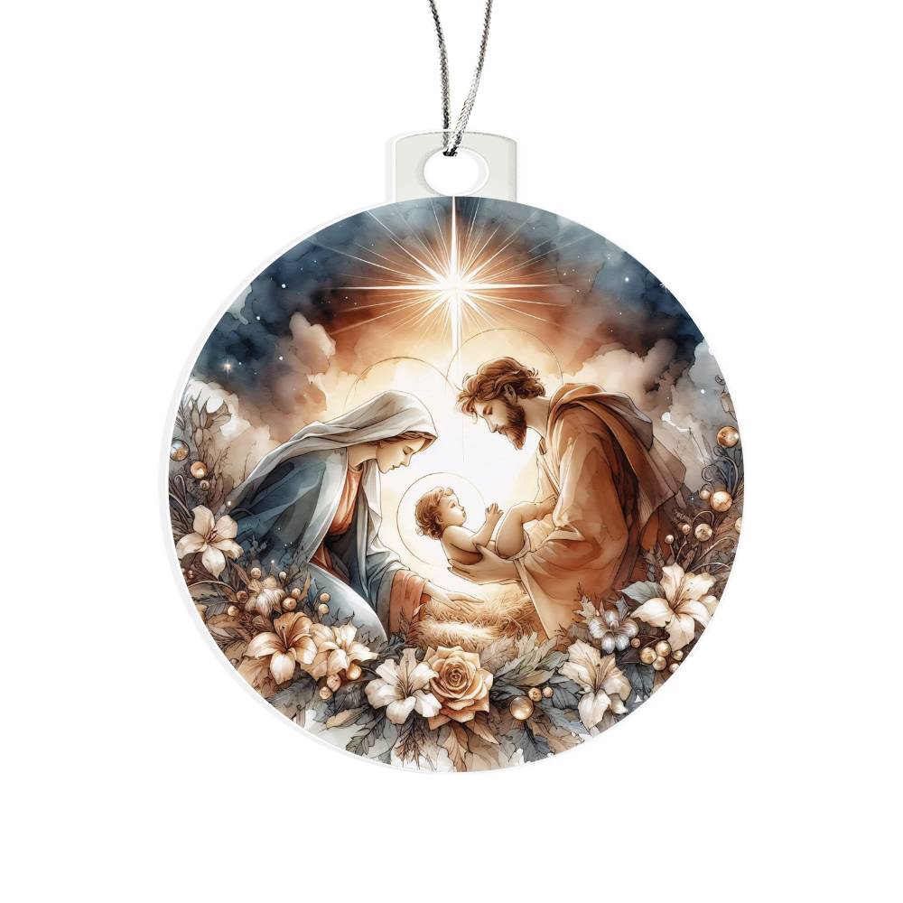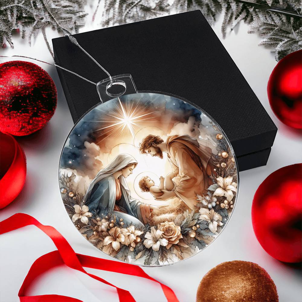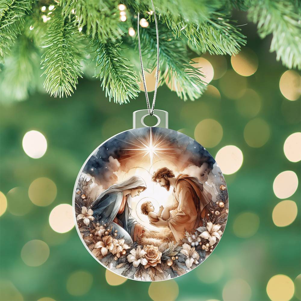 Bathed in the glow of the guiding star, this touching Nativity scene captures Mary and Joseph’s adoration as they cradle the newborn Savior. Surrounded by soft florals and radiant warmth, it reflects the wonder and peace of that holy night.